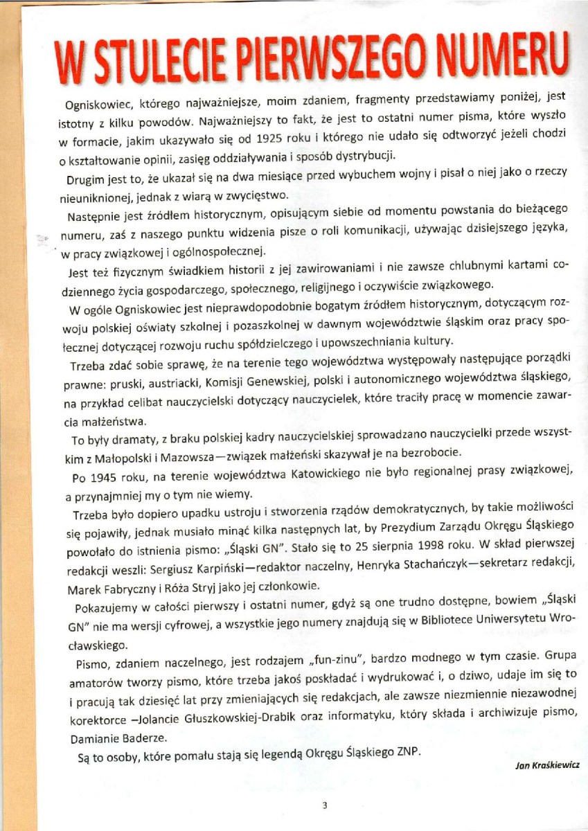 Od początku 2008 r. Okręg Śląski ZNP zaczął wydawać „ Ogniskowca”. Inicjatorem zmian i nowej formuły był ówczesny prezes Okręgu Śląskiego – Kazimierz Piekarz, a realizatorem- redaktor naczelny – Jan Kraśkiewicz . Numeracja została zachowana ze „Śląskim GN” i zaczęła się od nr 1/08 (104-105). Zmienił się także nr ISNN, załatwiany w biegu, ale udało się go uzyskać na początku 2008 r. od nr 2./08(106-107) na winiecie pojawił się nr 1899-0924.