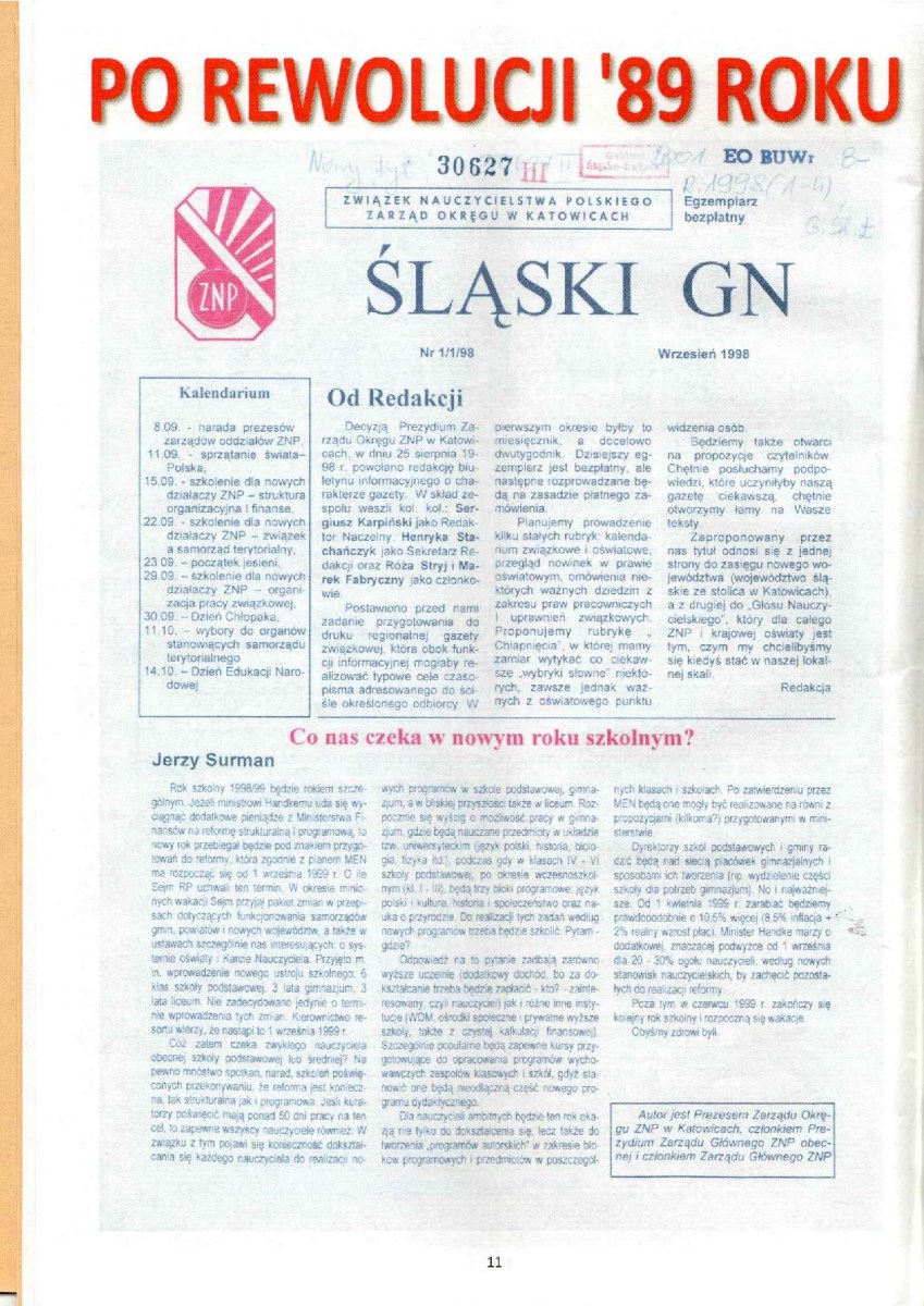 Decyzją Prezydium Zarządu Okręgu ZNP w Katowicach 25 sierpnia 1998 roku (początek kadencji ZNP 1998-2002) powołano redakcje biuletynu informacyjnego o charakterze gazety: „Śląski GN”. W skład zespołu weszli: Sergiusz Karpiński (O. Bytom) jako Redaktor Naczelny, Henryka Stachańczyk