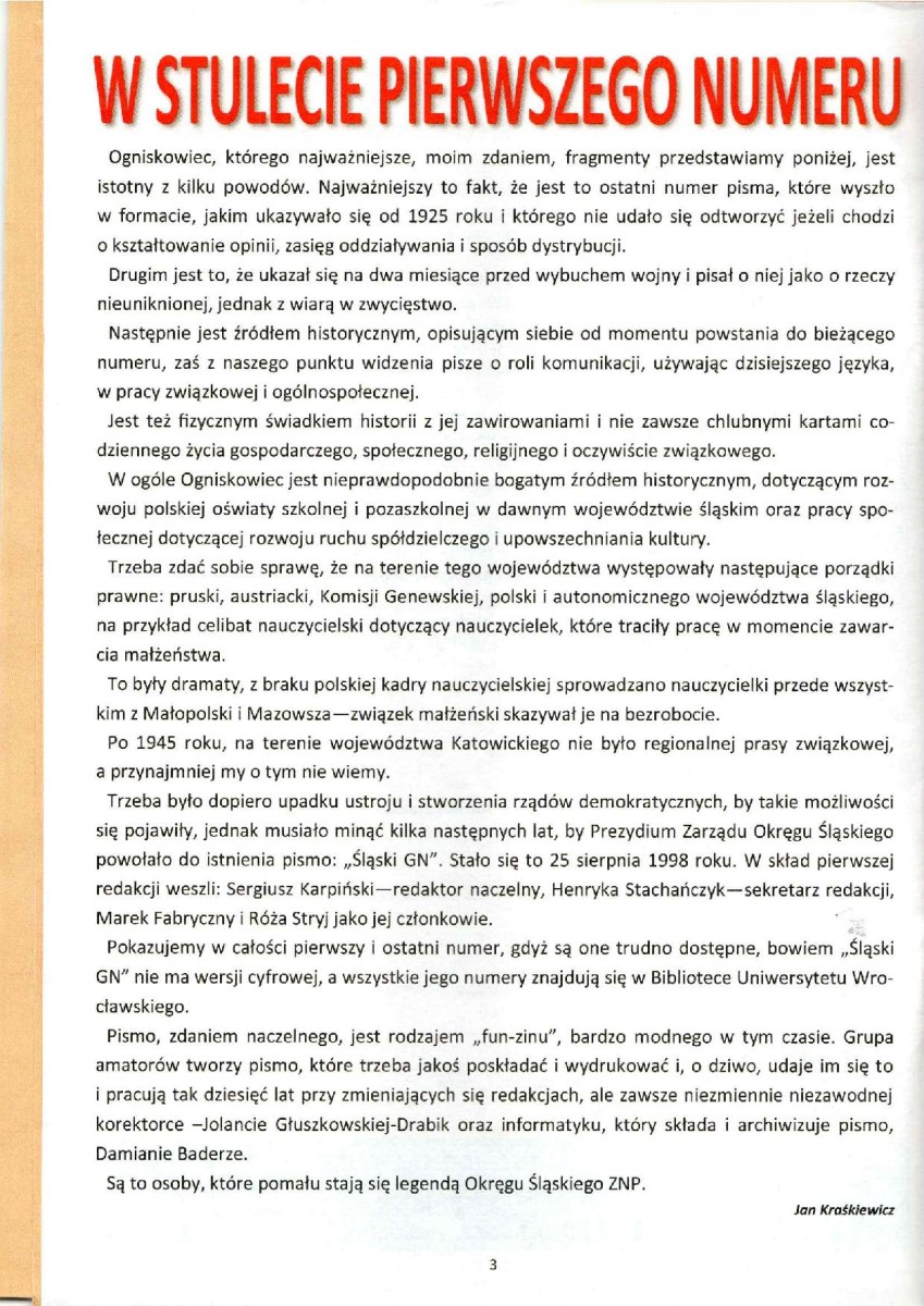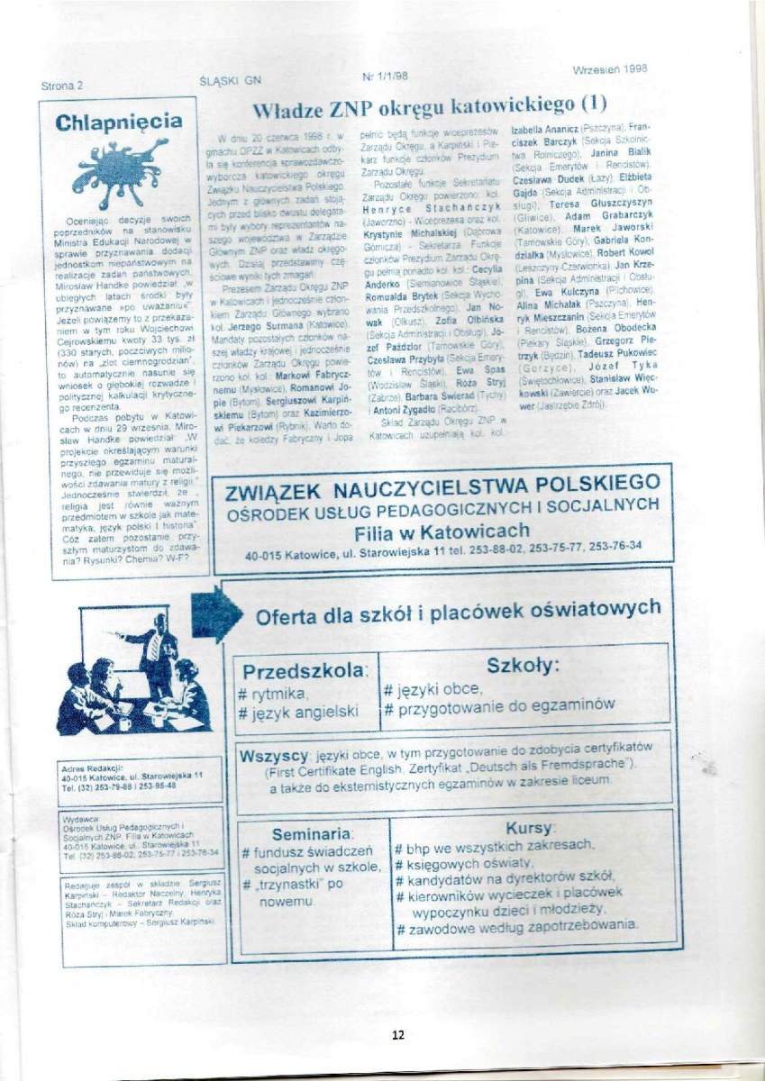 (O. Jaworzno) (Sekretarz Redakcji), Róża Stryj (O. Zabrze), Marek Fabryczny (O. Mysłowice) – Wydawca. Kol. Sergiusz Karpiński składał numer w zakupionym przez Okręg programie Publisher, Marek Fabryczny po odejściu kol. Karpińskiego został redaktorem naczelnym i wydawcą Śląskiego GN (Śląskiego Głosu Nauczycielskiego) w ramach OUPIS-u Filia w Katowicach.