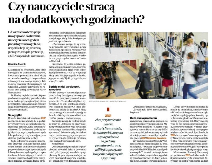 ZNP chce przywrócenia zapisu z Karty Nauczyciela, który został usunięty w 1992 roku i mówił o tym, że nauczyciel otrzyma wynagrodzenie za godziny ponadwymiarowe, jeśli był w pracy, ale lekcje nie odbyły się nie z jego winy – mówi dzisiaj, 7.10 w rozmowie z „Gazetą Wyborczą” wiceprezes ZG ZNP Urszula Woźniak. – Związek wnioskował o to już na etapie opiniowania projektu nowelizacji Karty w kwietniu br.