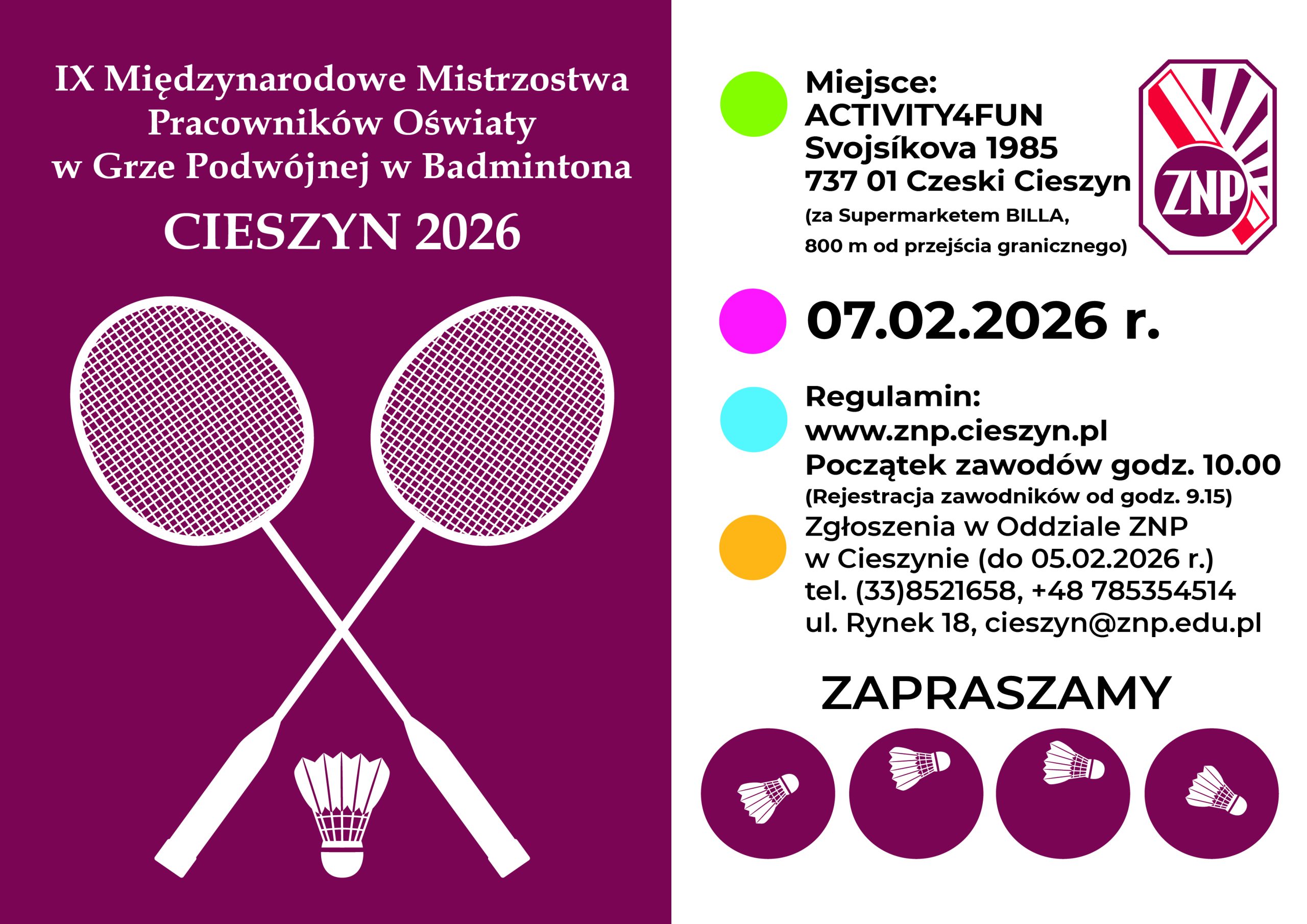 Zapraszamy do udziału w IX Międzynarodowych Mistrzostwach Pracowników Oświaty w Grze Podwójnej w Badmintona – CIESZYN 07.02.2026 r.