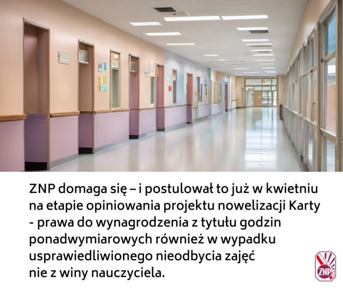 W ostatnich miesiącach ZNP podczas prac grup roboczych oraz w swojej opinii do projektu nowelizacji Karty z kwietnia 2025 r. postulował doprecyzowanie art. 35 ust. 3d poprzez utrzymanie prawa do wynagrodzenia z tytułu godzin ponadwymiarowych również w wypadku usprawiedliwionego nieodbycia zajęć.