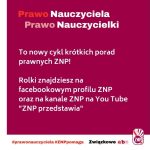 Prawo Nauczycielki, Prawo Nauczyciela – to nowy cykl krótkich porad prawnych ZNP, które znajdziesz na facebookowym profilu ZNP oraz na kanale ZNP na You Tube „ZNP przedstawia”. Prawo Nauczycielki, Prawo Nauczyciela: Prawo do odpoczynku podczas wielodniowej wycieczki szkolnej Nauczycielu, Nauczycielko! Czy wiesz, że: w przypadku wielodniowej wycieczki szkolnej – w każdej dobie przysługuje Ci prawo do co najmniej 11 godzin nieprzerwanego odpoczynku, a także w każdym tygodniu prawo do co najmniej 35 godzin nieprzerwanego odpoczynku. Razem łatwiej zadbać o prawa nauczycieli i godne warunki pracy. ZNP = bezpłatne poradnictwo prawne dla członków!