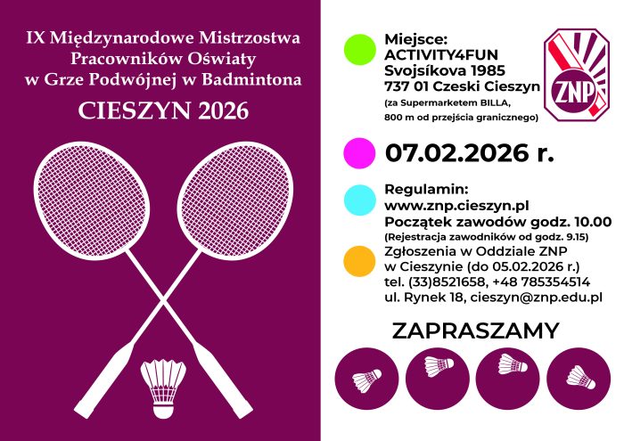 Koleżanki i Koledzy. Zapraszamy do udziału w IX Międzynarodowych Mistrzostwach Pracowników Oświaty w Grze Podwójnej w Badmintona – CIESZYN 07.02.2026 r. W załączeniu – regulamin, plakat i karta zgłoszenia