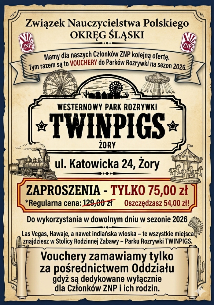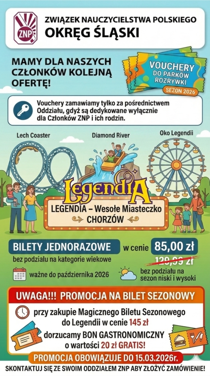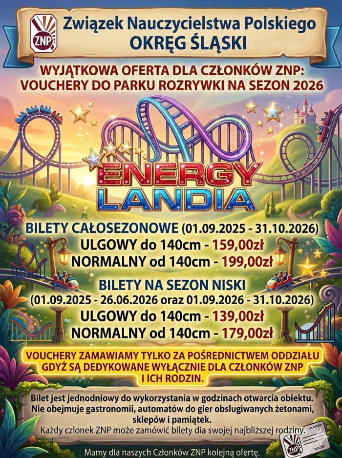 Mamy dla naszych Członków ZNP kolejną ofertę. Tym razem są to VOUCHERY do Parków Rozrywki na sezon 2026.