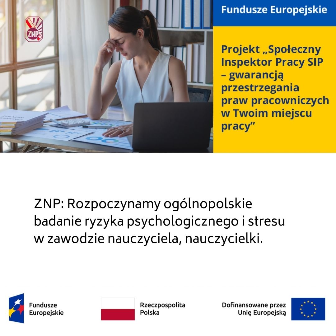Badanie „Diagnoza skali i struktury stresu zawodowego oraz ryzyka psychospołecznego wśród nauczycieli/nauczycielek wszystkich szczebli edukacji w Polsce” jest prowadzone w ramach projektu unijnego „Społeczny Inspektor Pracy SIP – gwarancją przestrzegania praw pracowniczych w Twoim miejscu pracy” współfinansowanego z Programu Fundusze Europejskie dla Rozwoju Społecznego, Priorytetu FERS.04.00, Działania FERS.04.03.